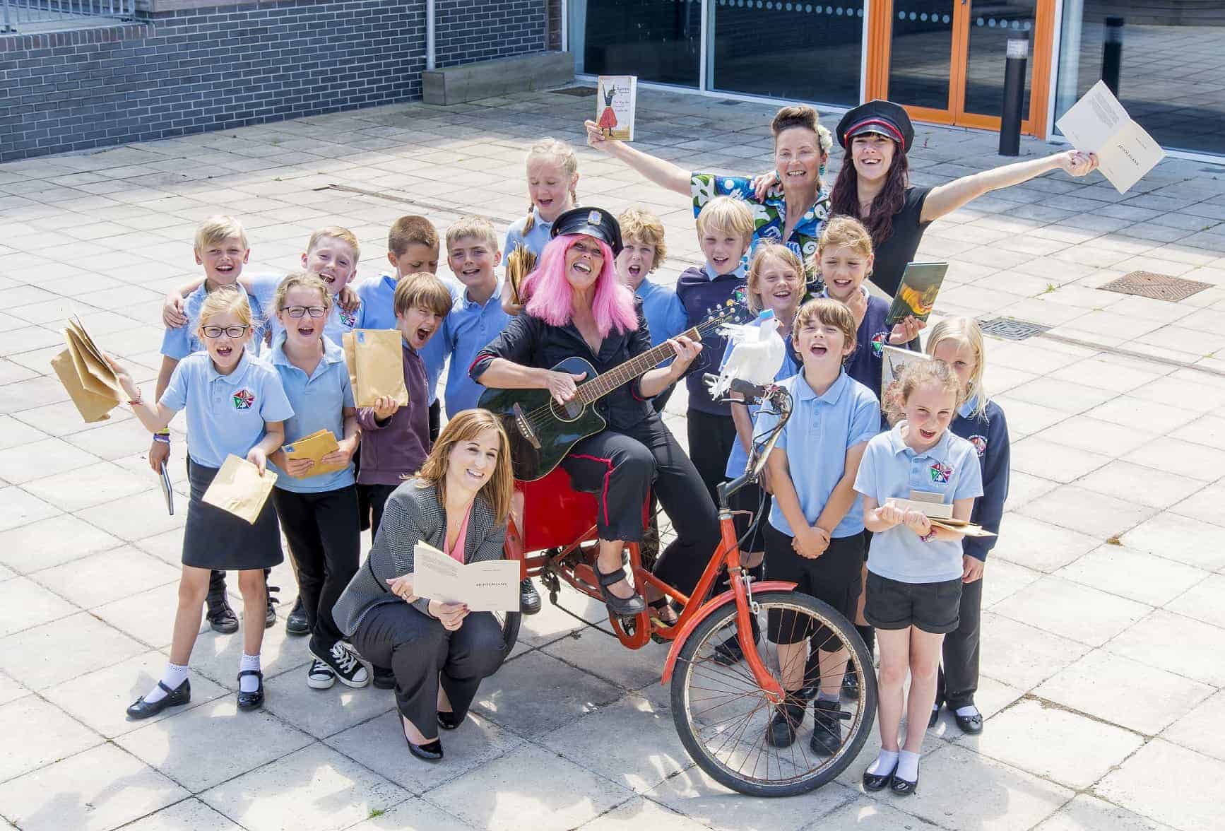- £1,500 towards a creative literacy project working with children on the Isles of Scilly, Mousehole, Newlyn and Penzance, taking the history of Royal Mail Ships as inspiration. Poetry postie Sally Crabtree held workshops with pupils at Five Islands School on St Mary’s to show that poetry can be fun and doesn’t have to be boring. She then turned the children’s poetry into postcards, which she delivered at the Sea Salts and Sail Festival in Mousehole and, ultimately, to celebrate the UN’s World Post Day. The Poetry Postie character was first commissioned by the Postal Heritage Museum and Archive and has since performed at festival and events all over the country – from small village fetes to large music festivals such as Womad.