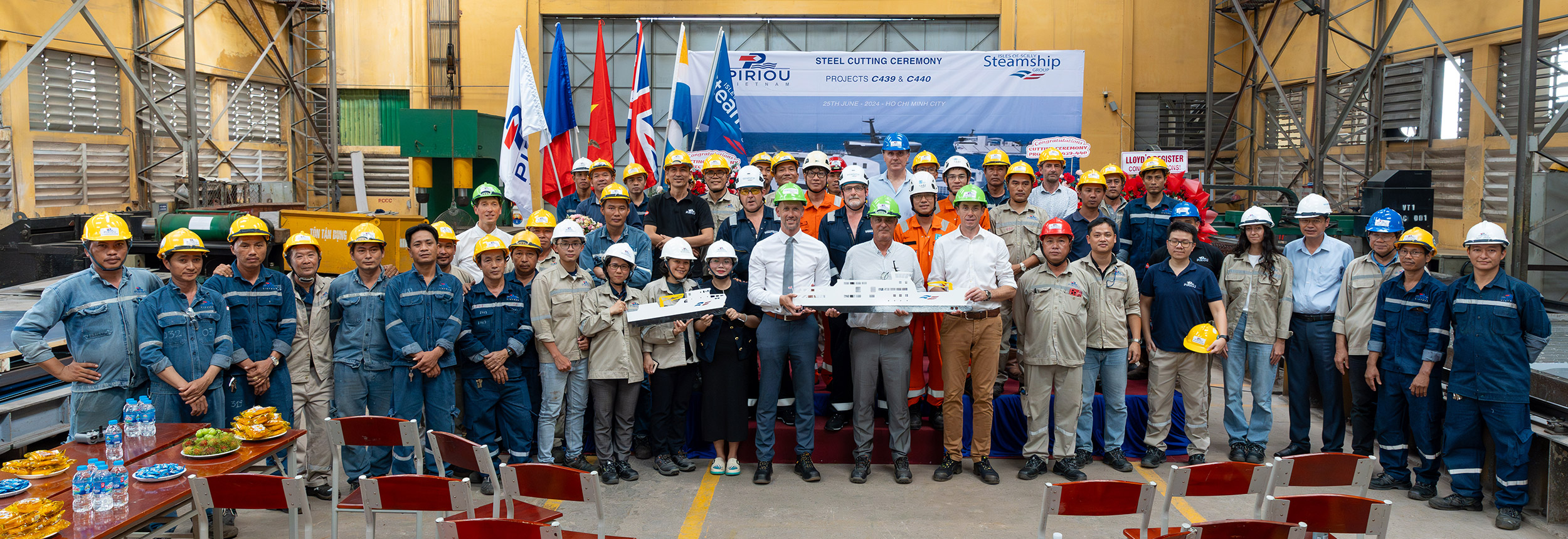 Building work is now officially underway on the Isles of Scilly Steamship Group’s (ISSG) new passenger and freight vessels, with the first steel for the new ships being cut during a special ceremony at Piriou’s shipyard in Vietnam.