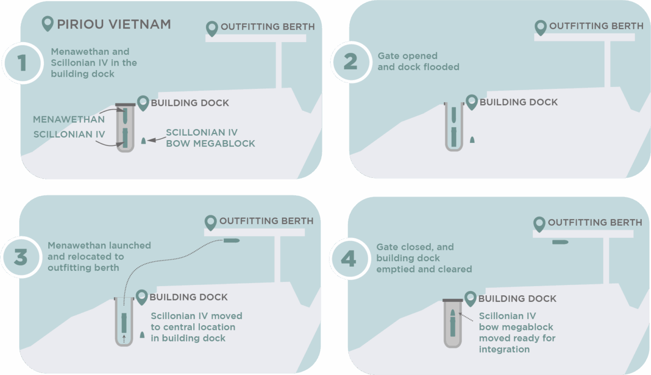 Once Menawethan is safely floated out, construction work will continue on Scillonian IV in the building dock. Following this, Scillonian IV’s bow megablock will then be placed in the dock for integration, some days after the launching.